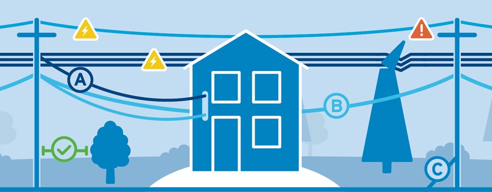 A: The graphic below provides an overview of the power lines that surround and connect to your home. It’s important to know what they are and if trees coming into contact with the wires could have an impact on power delivery.