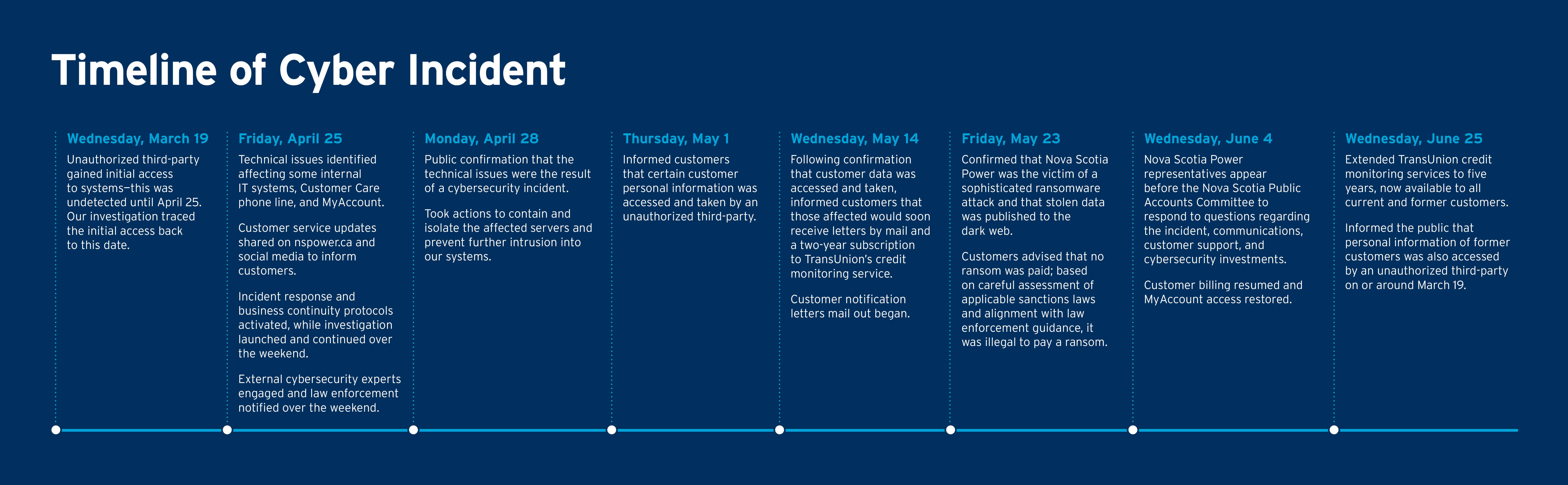 At Nova Scotia Power, our commitment to providing reliable power to Nova Scotians has been unwavering for over 100 years. We recognize that the recent cyber event has affected the trust we have built with our customers, and I want to acknowledge and apologize for the concern and disruption this has caused.