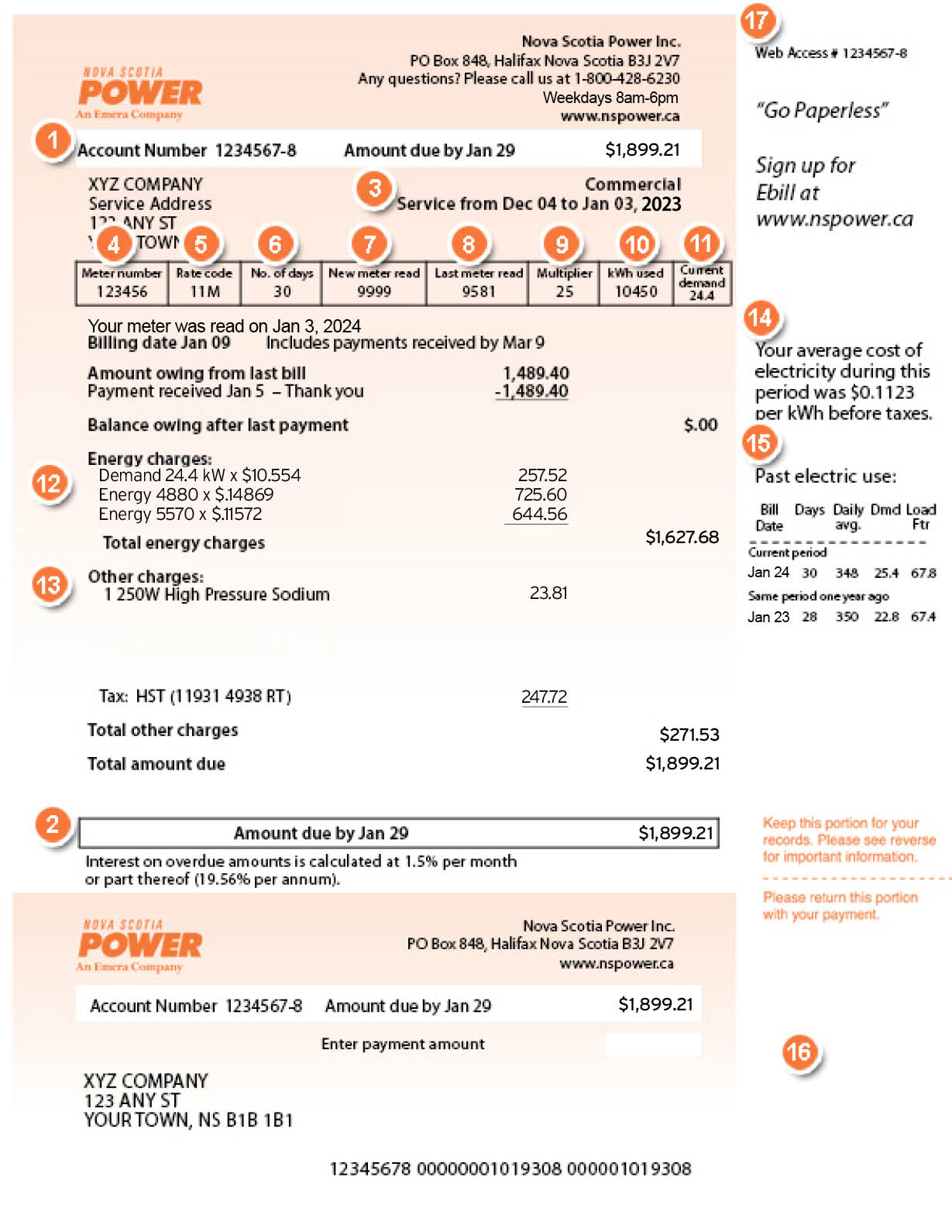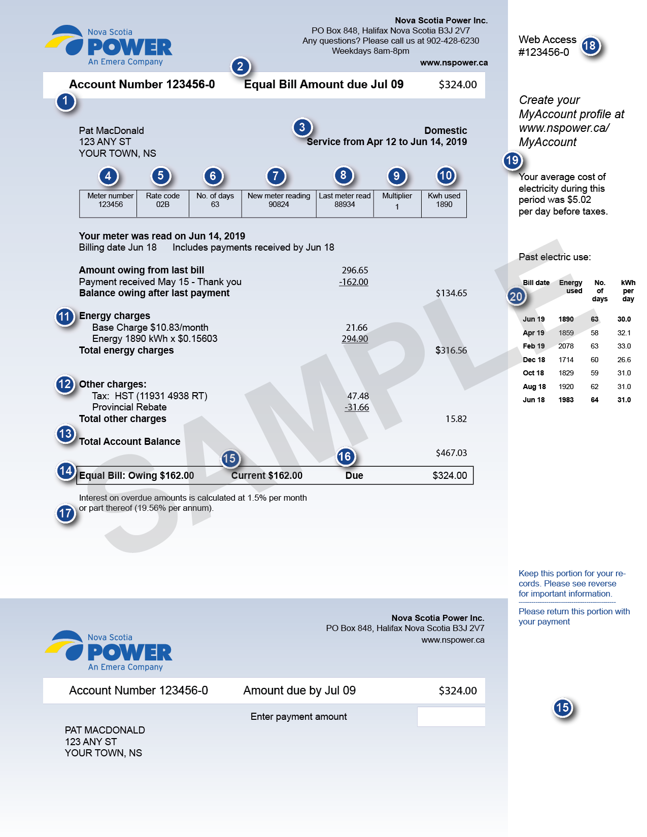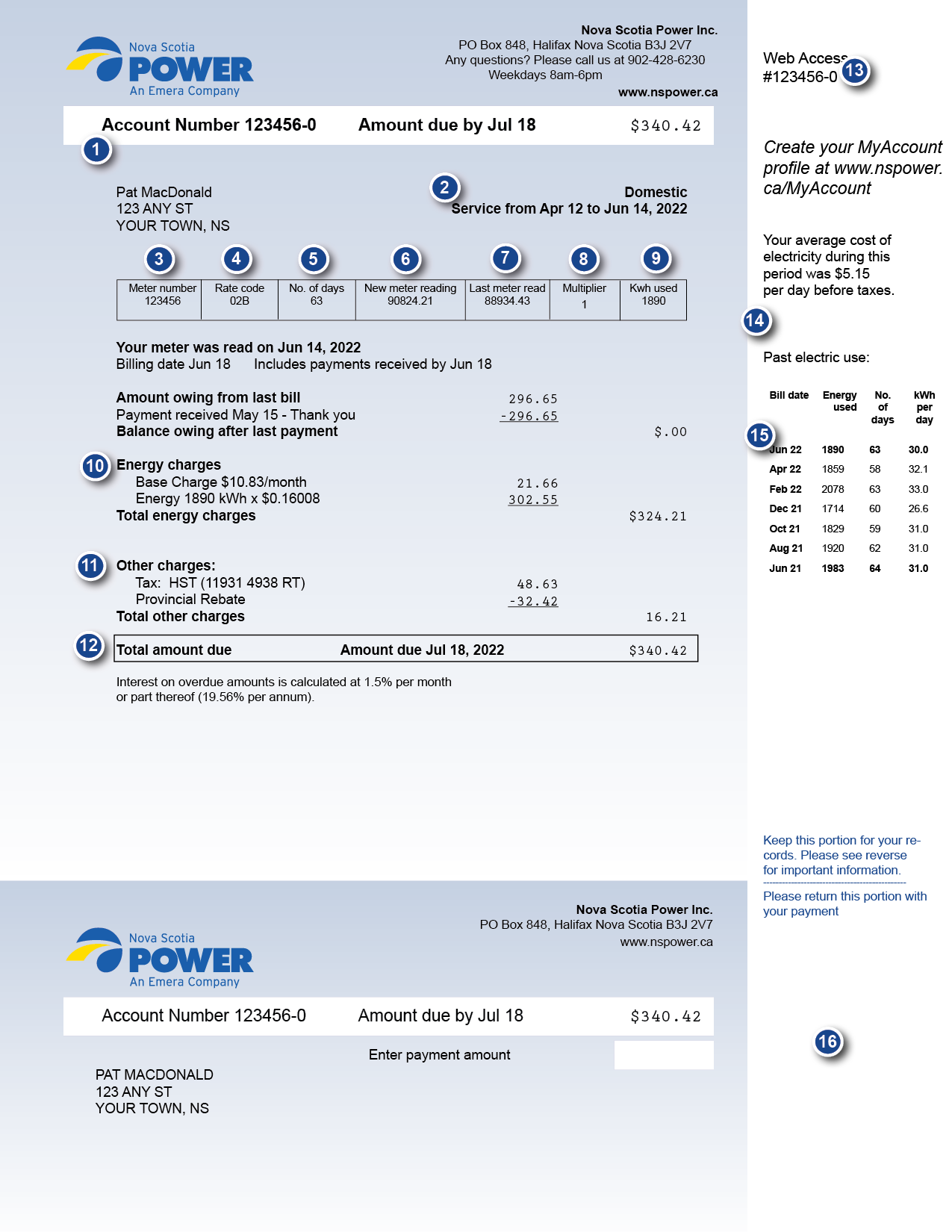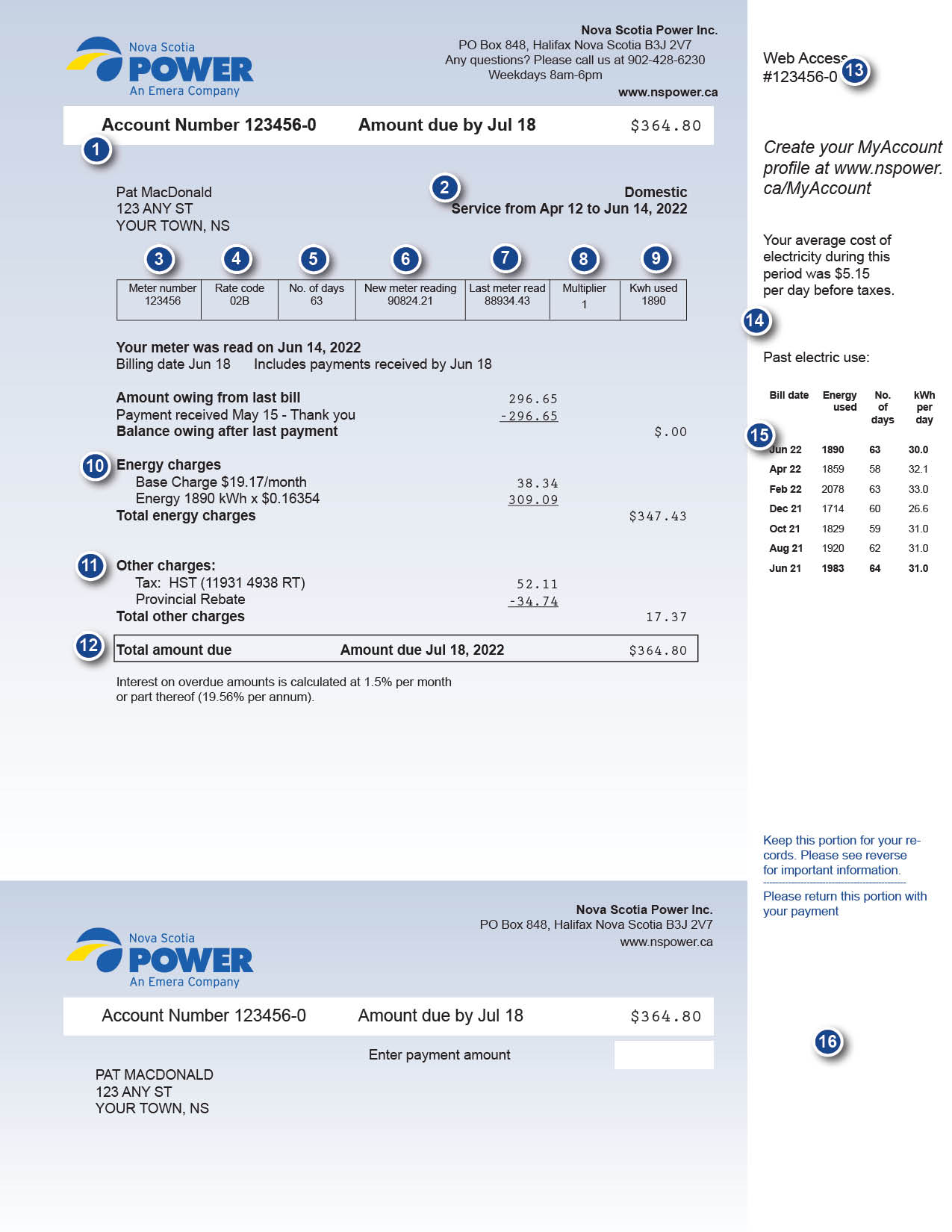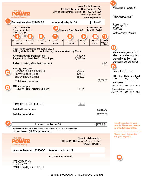 This section shows any applicable charges for streetlights, water heaters, or heating systems financed through Nova Scotia Power, service charges, adjustments, taxes, etc.