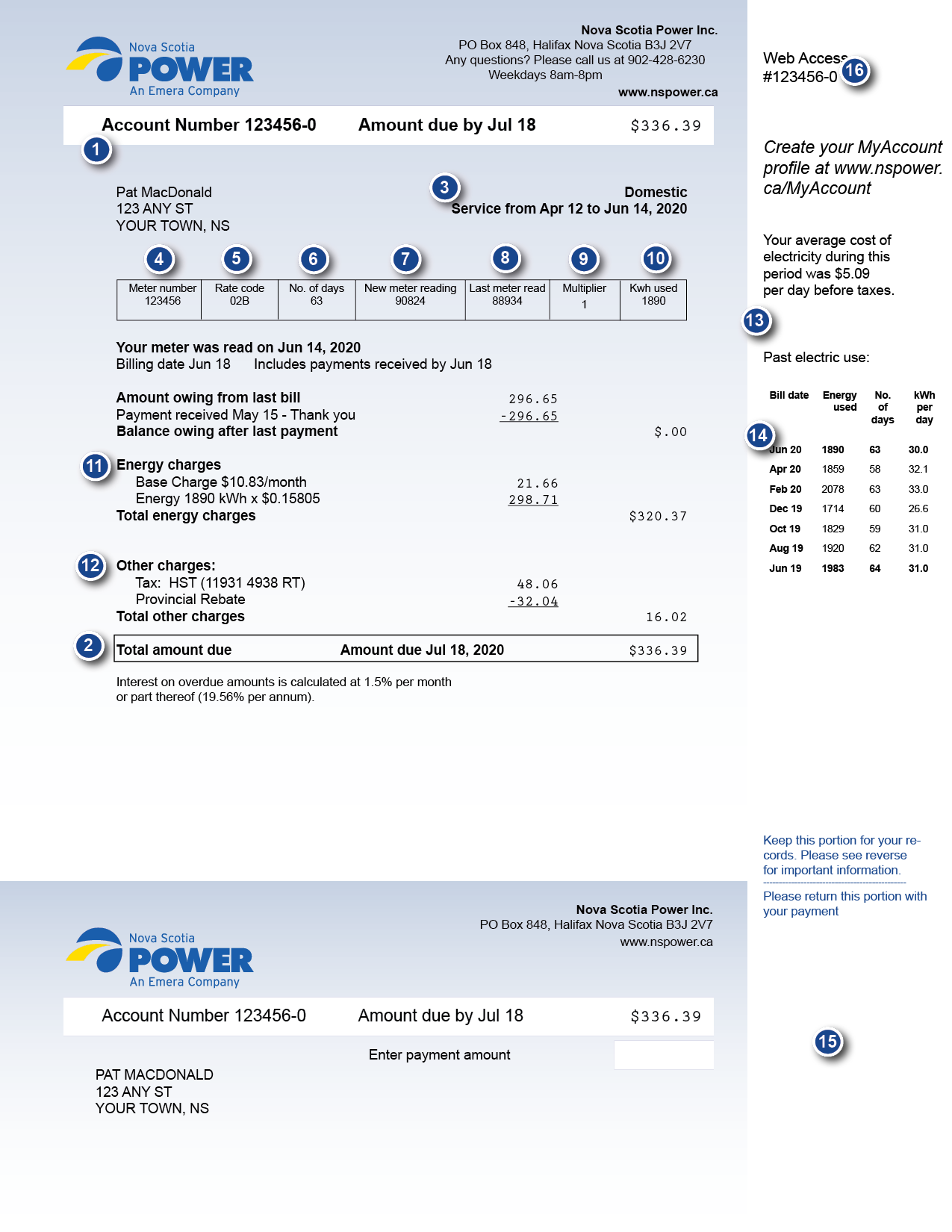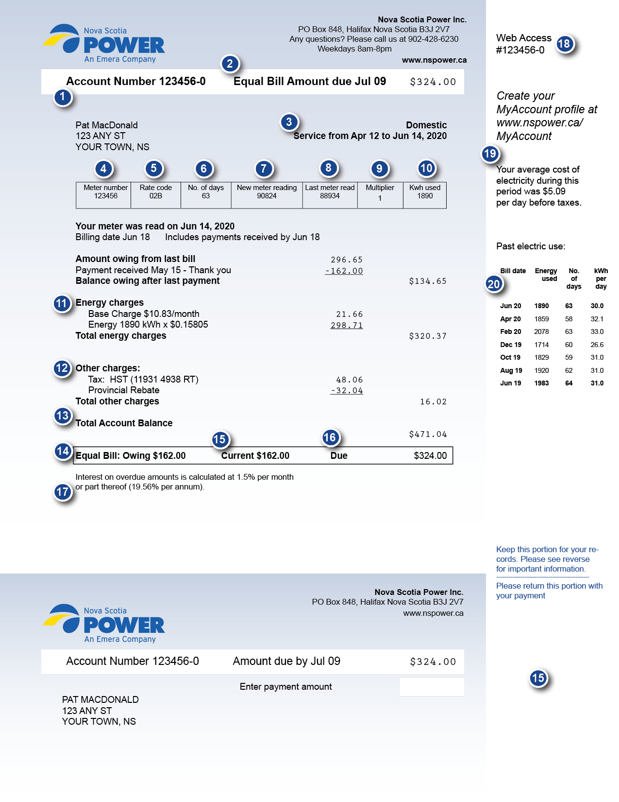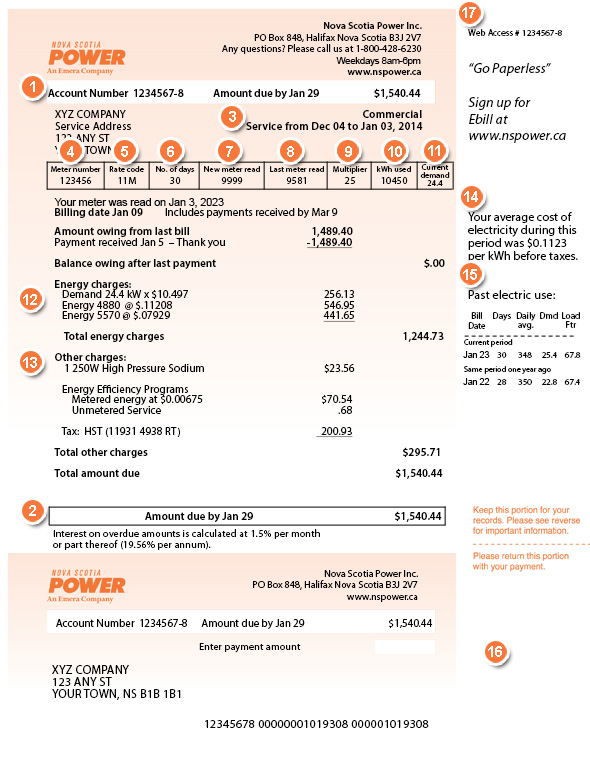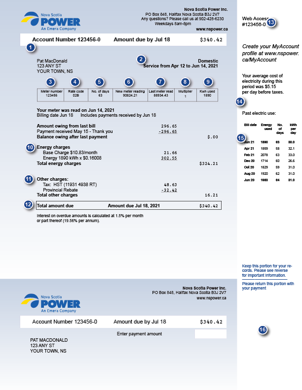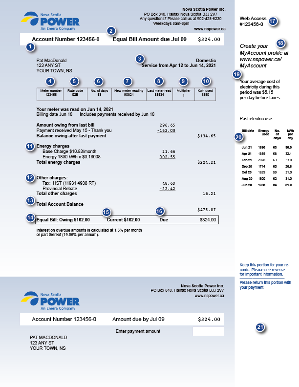 - Other Charges This section shows any applicable charges for streetlights, water heaters, or heating systems financed through Nova Scotia Power, service charges, adjustments, taxes, etc.