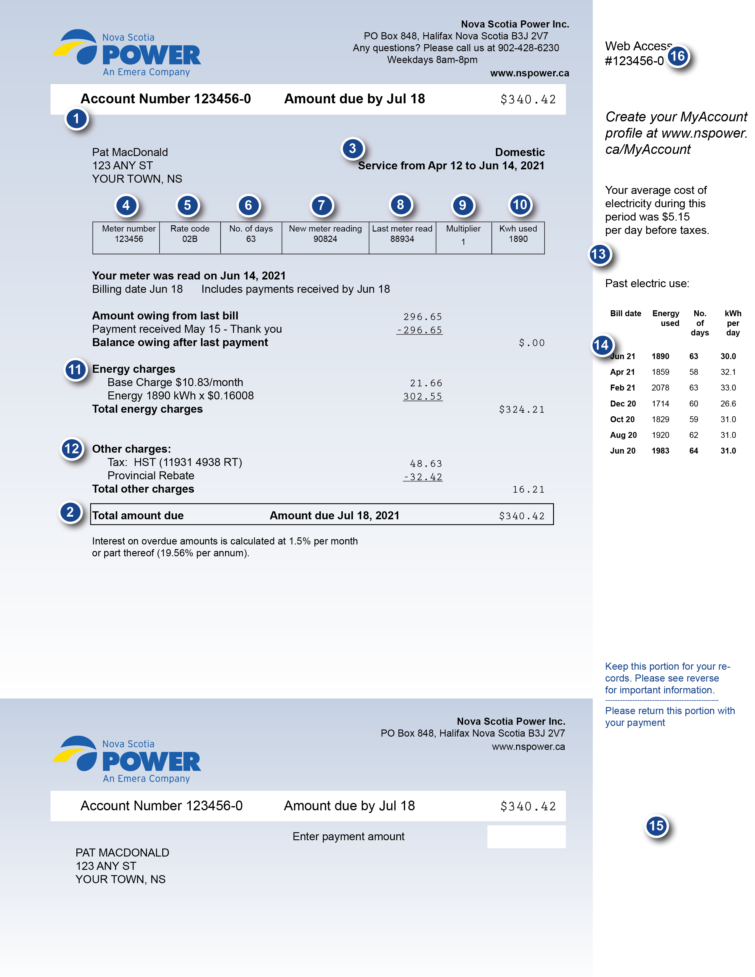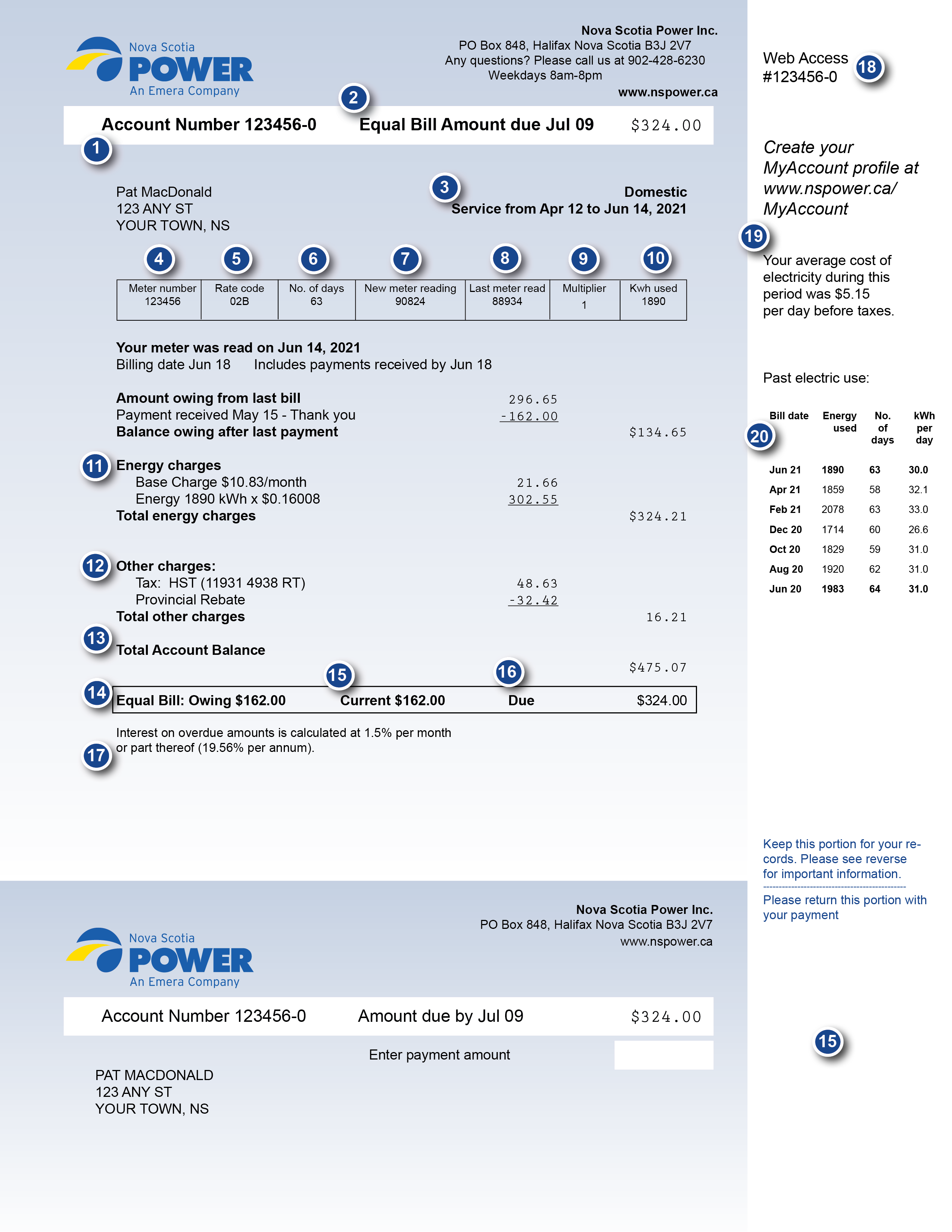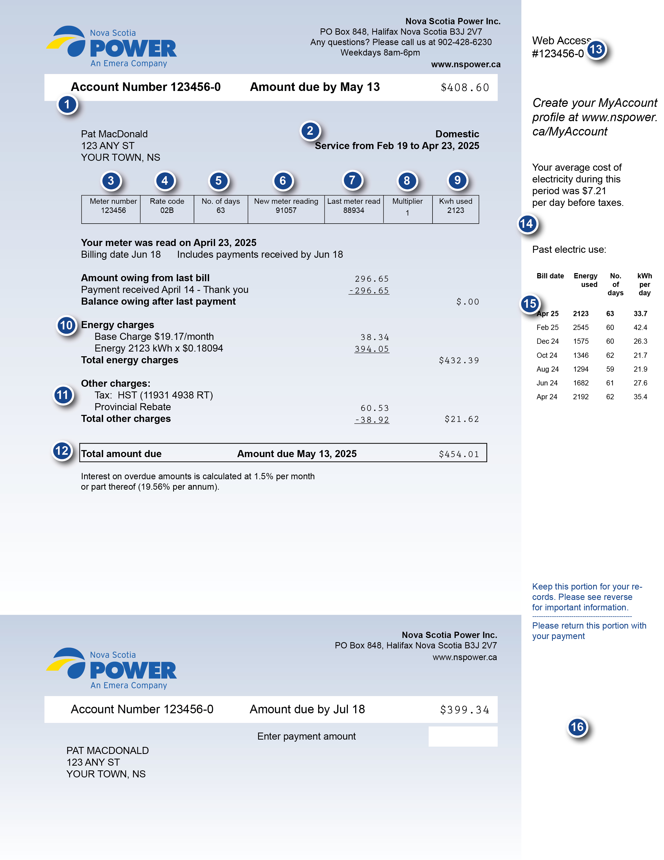 - Other Charges This section shows any applicable charges for streetlights, water heaters, or heating systems financed through Nova Scotia Power, service charges, adjustments, taxes, etc.